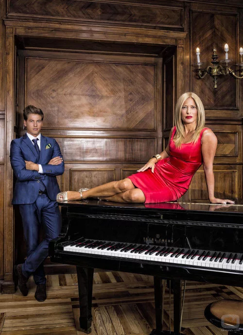 Toñi posa sobre un piano mientras su hijo la observa de pie.