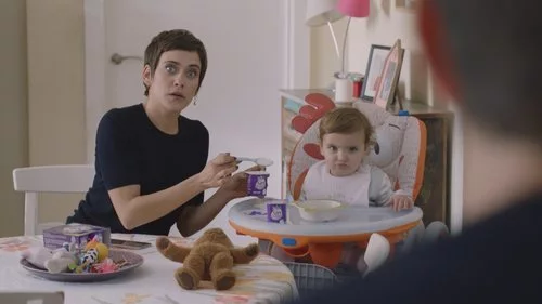 La madre, interpretada por María León, trata de dar un yogur a su enfurruñada hija cuando alguien las sorprende.