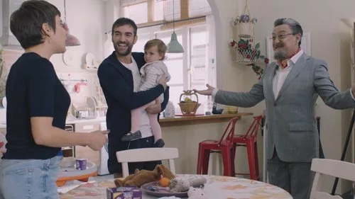 Carmen parece muy sorprendida ante la visita del personaje de Mariano Peña, mientras que Iñaki sostiene feliz a Elaia.