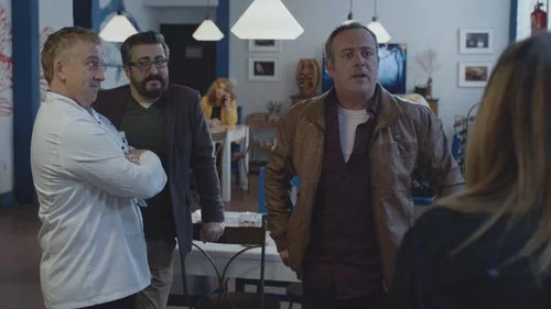 El personaje de Iker Galartza parece intimidado con una conversación que está teniendo junto a sus amigos, interpretados por Gorka Aguinagalde y Óscar Terol.