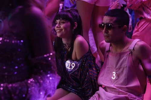 Mencía y Omar, los personajes encarnados por Martina Cariddi y Omar Ayuso, en una fiesta de la temporada 5 de 'Élite'.