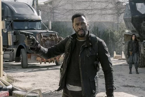 El personaje de Colman Domingo apunta a alguien mientras, a su espalda, la antigua miembro de los Buitres, Charlie, observa la escena.
