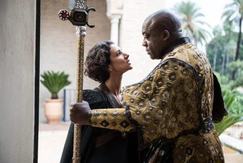Ellaria Sand conversando con un nuevo personaje, Areo Hotah. Capitán de la guardia de Doran Martell, es un hombre fuerte e imponente guerrero.