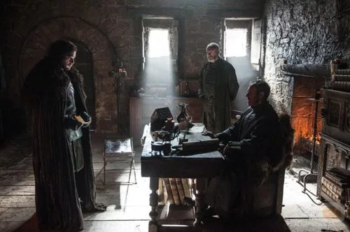 Jon Nieve, Stannis Baratheon y Davos Seaworth reunidos alrededor de una mesa conversando sobre los planes del ejército de Baratheon tras la batalla contra los salvajes.