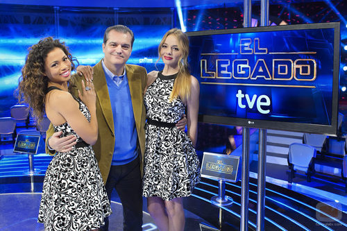 El presentador vasco posa junto a Isabel y Carolina, las dos azafatas que le acompañaran en el transcurso del concurso.