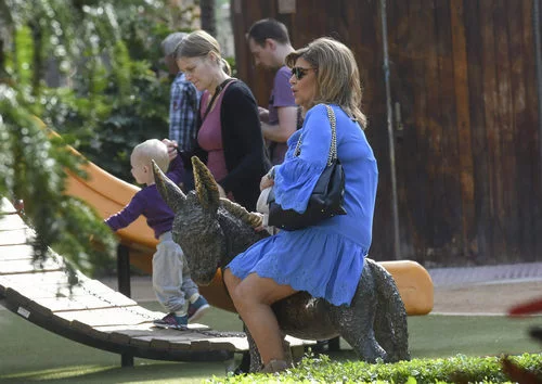 Terelu Campos se encuentra sentada en una estatua durante el rodaje del reality de la familia dentro de un parque de Málaga.