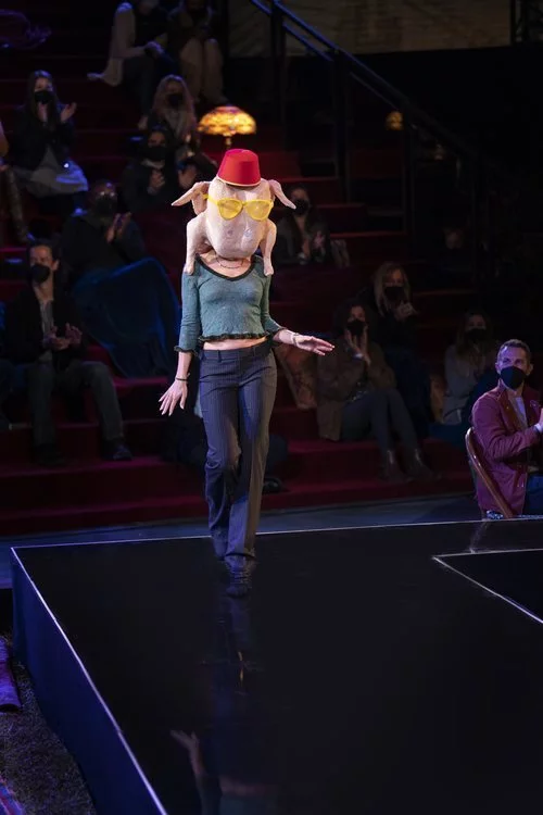 Un invitado sorpresa desfilando en la pasarela de 'Friends' con la ropa de Mónica y el pavo en la cabeza, recordando uno de los momentos más icónicos de la serie.