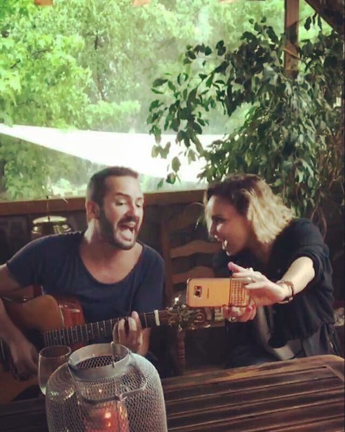 Alejandro Pareño con la guitarra y Chenoa cantando mientras se graban con el móvil, en el reencuentro que han hecho los concursantes de 'OT'1.