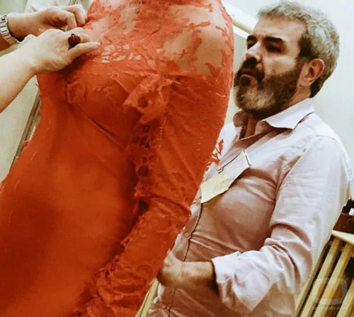 Caprile y su equipo dan los últimos retoques al estupendo vestido rojo con el que Anne Igartiburu retransmitió las Campanadas 2015 en TVE.