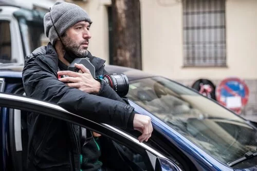 Rodrigo Sorogoyen sostiene una cámara durante una de las jornadas de grabación de la ficción antológica original de Movistar+.