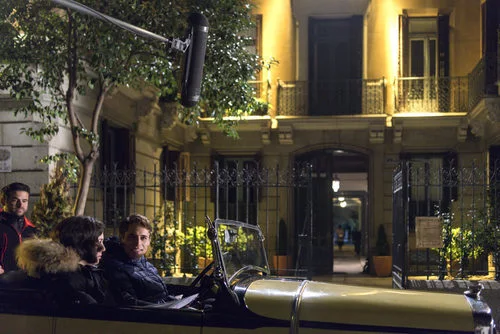 La actriz Blanca Suárez y el actor Martín Rivas aparecen montados en un coche en el rodaje de 'Las chicas del cable'.