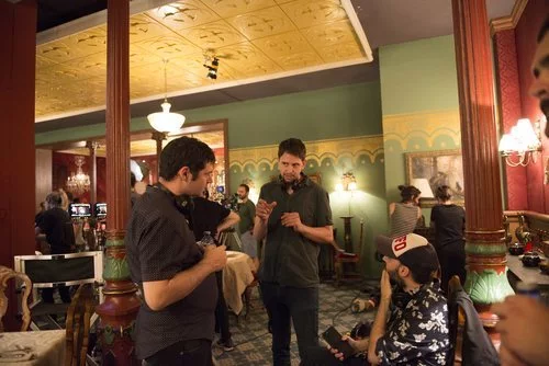 Los responsables creativos de la comedia de Movistar+ se reúnen durante el rodaje. Sarria también es el autor de la novela en la que se basa la serie: "El hombre que odiaba a Paulo Coelho".