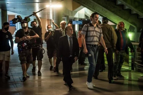 Los actores cruzan un estadio de fútbol durante el rodaje de la comedia original de Movistar+, en la que dan vida a periodistas deportivos.