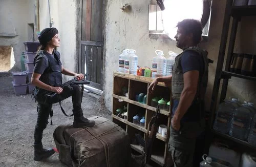 La sargento Martina Ibáñez y el agente Carlos Román, interpretados por los actores, se miran durante una escena de la segunda temporada de 'Los nuestros', que transforma Almería en Siria para su grabación.