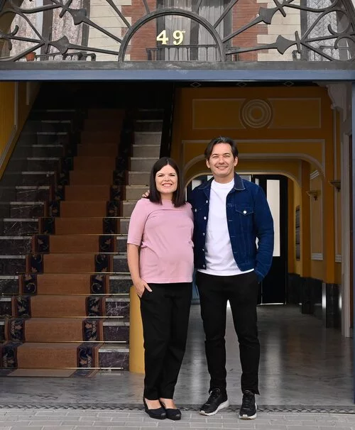Los hermanos Caballero posan ante el edificio de la decimotercera temporada de 'La que se avecina', situado en la ficticia calle Contubernio, 49.