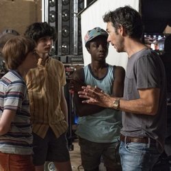 Noah Schnapp, Finn Wolfhard, Caleb McLaughlin y Shawn Levy en el rodaje de la tercera temporada de 'Stranger Things'