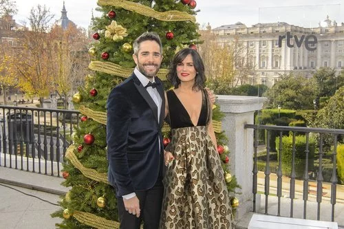 Roberto y Elena Sánchez en la presentación de la Navidad de TVE. Se les ve posando junto a un árbol de Navidad en la terraza del Teatro Real.