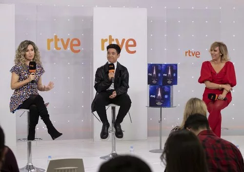Eva Mora y María Eizaguirre, junto Levi Díaz, representante español en Eurovisión Junior 2022, durante el evento organizado en RTVE para dar a conocer los artistas confirmados del Benidorm Fest.