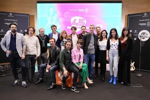 Todos los actores de '45 revoluciones' se hacen una foto grupal en la rueda de prensa para promocionar la serie de Antena 3 sobre la industria de la música pop en España.