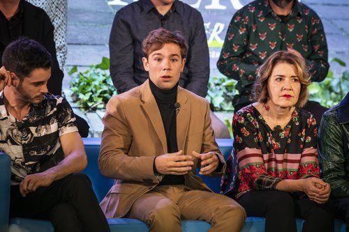 David Solans (Bruno Bergeron), Carlos Cuevas (Pol Rubio) y María Pujalte (María Bolaño) en la rueda de prensa de 'Merlí Sapere Aude', serie de Movistar+, en Barcelona.