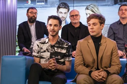 David Solans (Bruno Bergeron) y Carlos Cuevas (Pol Rubio) en la rueda de prensa de presentación de 'Merlí: Sapere Aude' en Barcelona.
