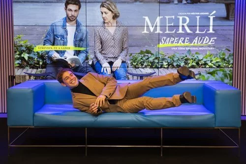 Carlos Cuevas interpreta a Pol Rubio en 'Merlí: Sapere Aude' en la ficción de Movistar+. El actor acude a la rueda de prensa de la serie en Barcelona y podemos verle felizmente tumbado sobre un sofá.