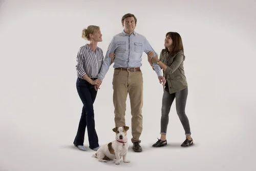 Salva Reina junto a María Esteve y Thais Blume, que posan divertidos junto al protagonista de 'Sabuesos', el perro Max.