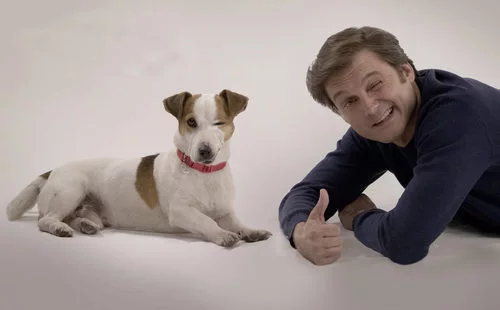 Alberto, interpretado por Salva Reina, guiña un ojo junto al perro detective Max en la nueva serie de TVE, 'Sabuesos'.
