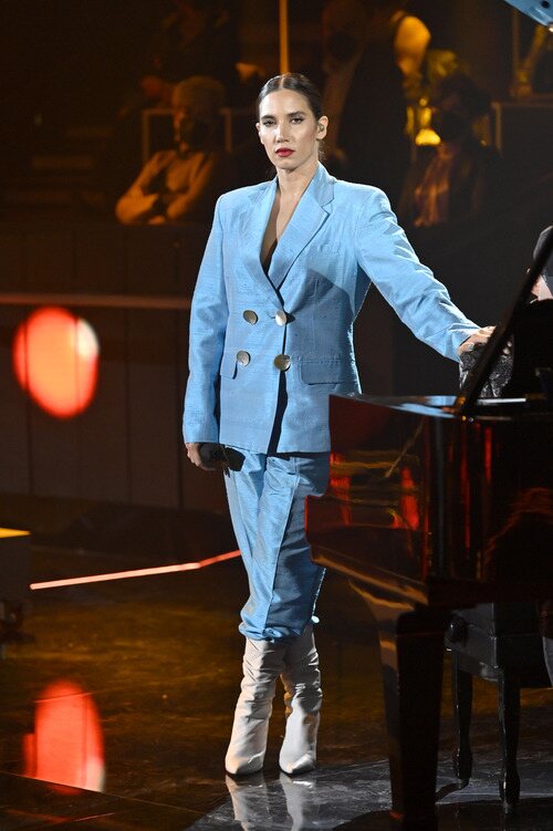 La cantante, apoyada en un piano mientras entona "Sevilla" desde el plató de 'El último viaje de Rocío', el homenaje a la cantante organizado por Telecinco.