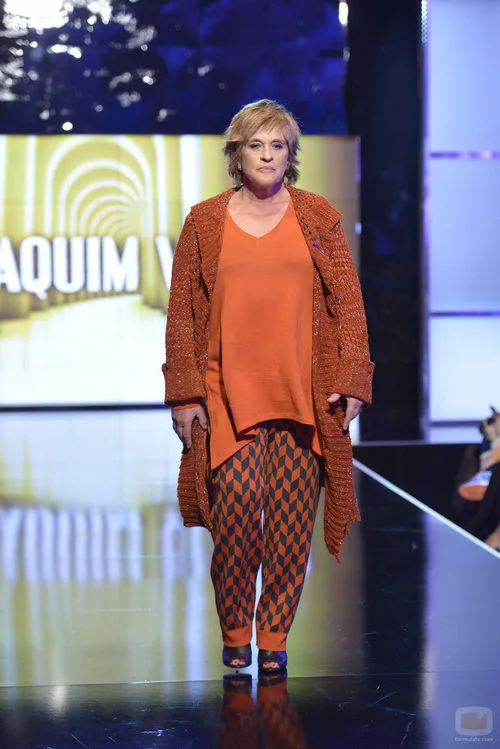 La colaboradora Chelo García Cortés desfiló con un diseño de Joaquim Verdú en la pasarela española de la 'Sálvame Fashion Week'.