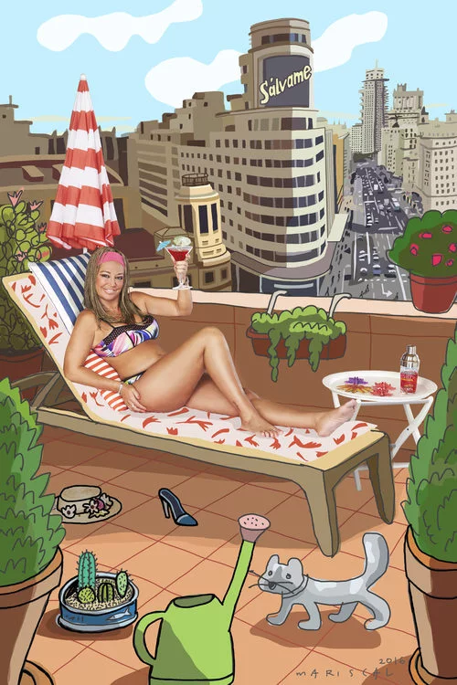 Belén Esteban es retratada por Javier Mariscal tomando el sol tumbada en bikini en una azotea de la Gran Vía madrileña.