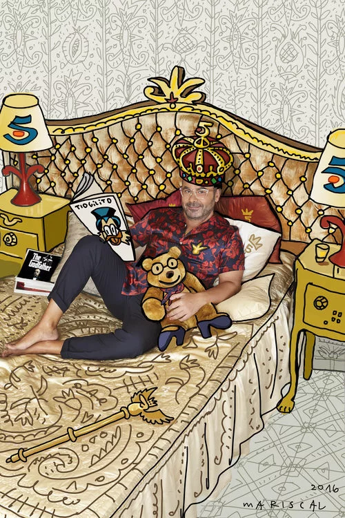 Jorge Javier Vázquez luce una corona tumbado en su cama en el retrato que ha realizado el diseñador Javier Mariscal.