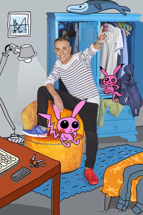El colaborador de 'Sálvame' Kiko Hernández es retratado sonriente en una habitación azul por el diseñador Javier Mariscal.
