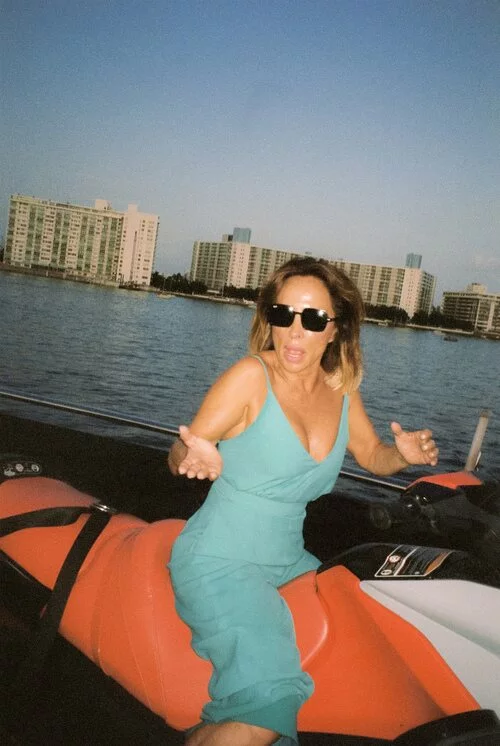 La colaboradora de La Fábrica de la Tele posa sobre una moto de agua durante el rodaje del docureality de Netfix en el que visita junto a sus compañeros los programas de habla hispana.