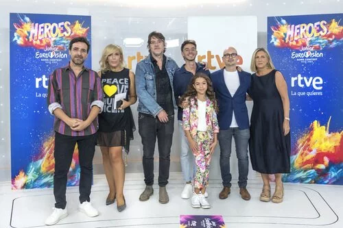 La pequeña Sandra Valero posa junto a David Parejo, Luis Ramiro, Diego Cantero, Alejandro Martínez, los compositores de su tema "Loviu" para Eurovisión Junior 2023 y también con María Eizaguirre y Ana María Bordas.