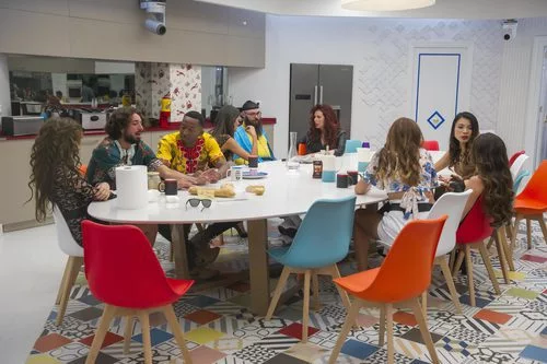 Segunda gala de 'GH Revolution'. Algunos de los concursantes sentados en la mesa de la cocina que, por primera vez, está separada del salón.