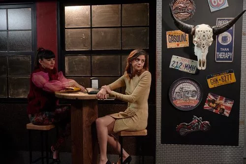 Yolanda Morcillo y Lola Trujillo sentadas en una de las mesas del garito rockabilly de Coque en la parte final de la temporada 12 de 'La que se avecina'.