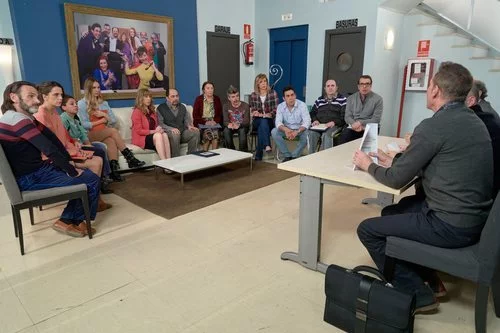 Fermín (Fernando Tejero), Lola (Macarena Gómez), Nines (Cristina Medina), Raquel (Vanesa Romero), Berta (Nathalie Seseña), Antonio (Jordi Sánchez), Fina (Petra Martínez), Coque (Nacho Guerreros), Maite (Eva Isanta), Amador (Pablo Chiapella), Agustín (Carlos Areces) y Bruno (Luis Merlo) frente a la mesa en una reunión durante la última parte de la temporada 12 de la serie de Telecinco.