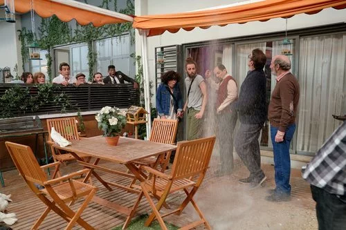 Todos los vecinos ven asombrados cómo caen restos de tierra del edificio desde el jardín del bajo B, la residencia actual de Enrique Pastor (José Luis Gil) y Bruno Quiroga (Luis Merlo).