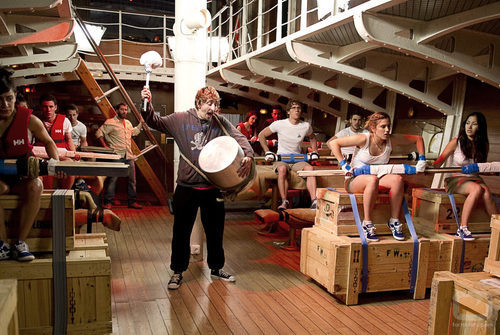 Burbuja toca un tambor ante la atenta mirada del resto de compañeros de 'El Barco'.