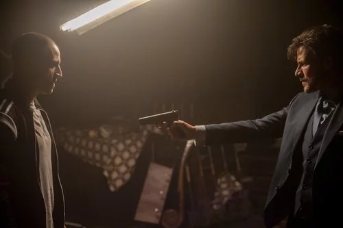 Tomás Guerrero apuntando con una pistola a su hermano Clemente Guerrero en una escena de la temporada 2 de la serie.