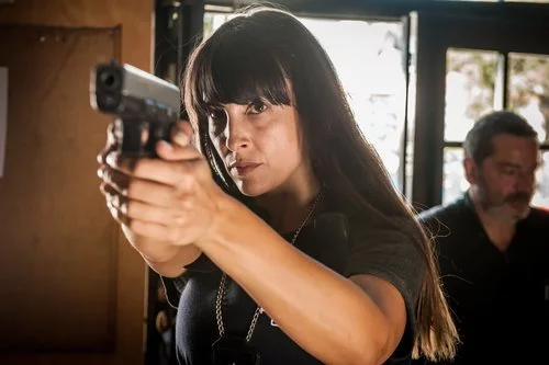 La actriz, que encarna a Bárbara, sostiene una pistola en una escena rodada para la segunda temporada de la serie.