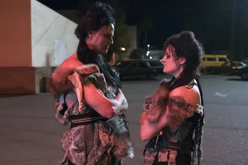 Sheila "the She-Wolf" y un chico hablan disfrazados de cavernícolas en una escena de la segunda temporada de 'GLOW'.