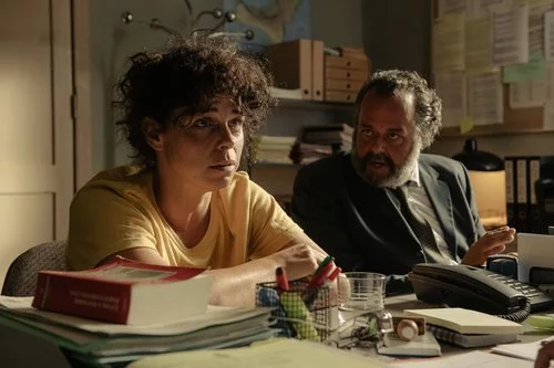 Candela y Luifer están sentados tras una mesa con cara de preocupación mientras mantienen una conversación en 'Hierro', la serie de Movistar+.