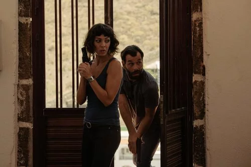 Iris Díaz interpreta a su personaje mientras sujeta una pistola con las dos manos en la nueva temporada de la serie de Movistar+.