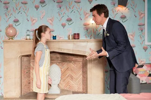 Lucía Balas (niña imaginaria) y Javier Veiga (Javier Rubirosa) comparten escena en un casa, en la segunda temporada de 'Pequeñas coincidencias'.