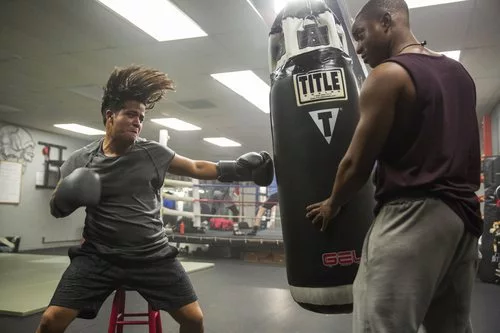 Caleb, una nueva incorporación en la segunda temporada de 'Por 13 razones', interpretado por R.J. Brown, sujeta el saco de boxeo mientras Tony lo golpea.