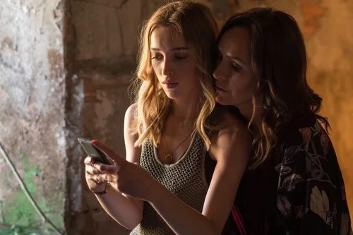 La madre de Albert, Lily Hill, interpretada por Juliet Aubrey, acercándose por la espalda a Lotti, el miembro femenino de la banda de 'Snatch', que encarna Phoebe Dynevor.