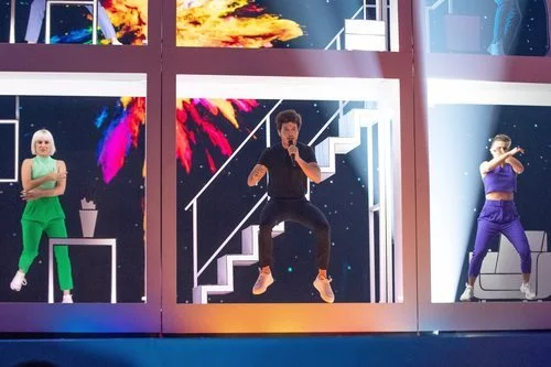 El catalán Miki Núñez cantando y bailando durante el segundo ensayo del festival de Eurovisión 2019, donde interpreta "La Venda".