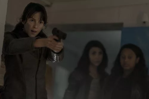 La actriz Annet Mahendru es Huck en The Walking Dead: World Beyond', la joven armada con una pistola. Junto a ella aparecen Aliyah Royale (Iris) y Alexa Mansour (Hope).